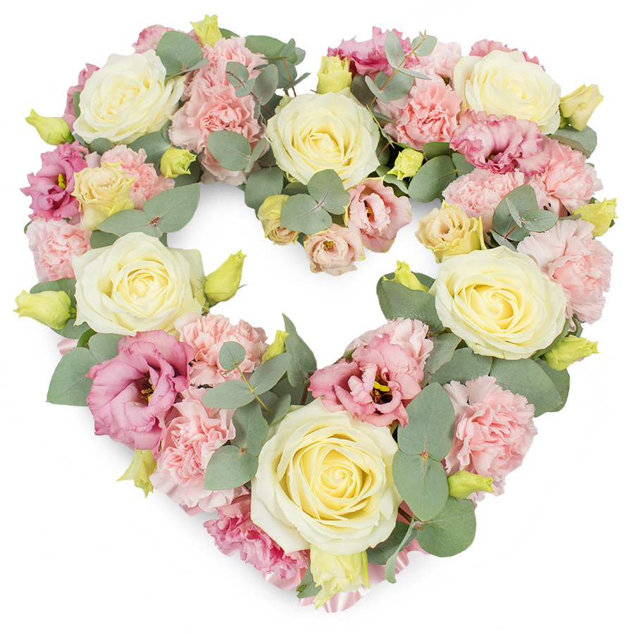 Celebrate the memory of a loved one with our Radiant Heart Memorial Bouquet. This exquisite arrangement combines white roses, pink carnations, and pink lisianthus, accented with vibrant eucalyptus leaves, all beautifully arranged into an open heart shape.